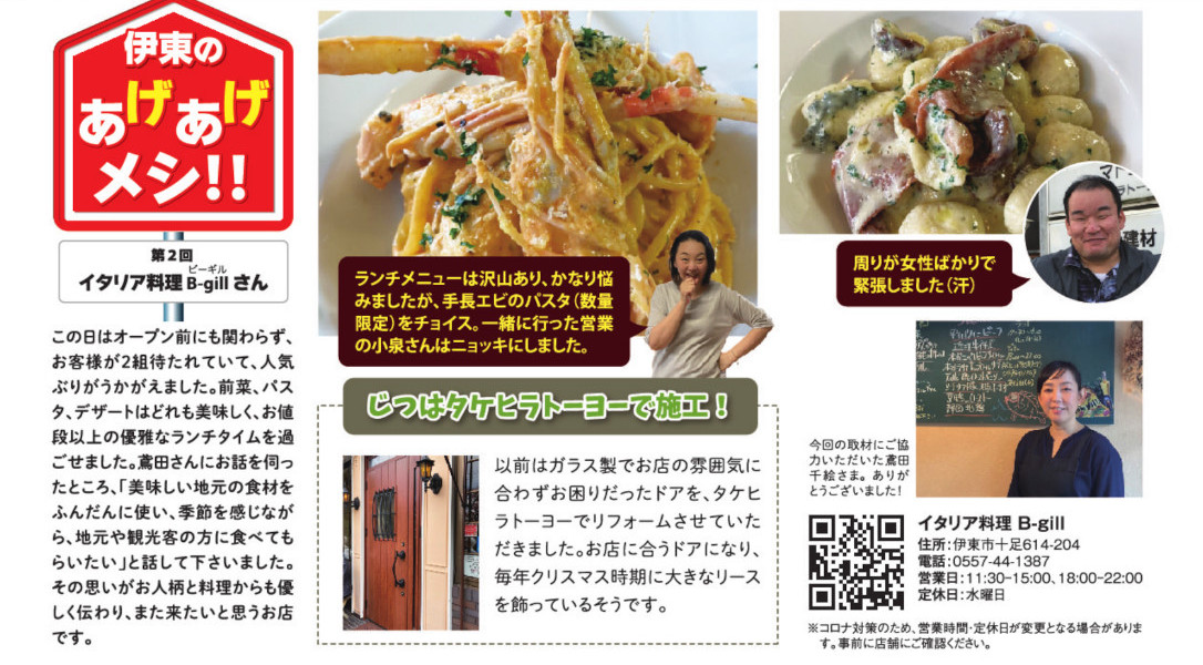こちらも取材をして、パスタの写真や飲食店の方の紹介、タケヒラトーヨー様が施工した外観部分の説明を載せています。